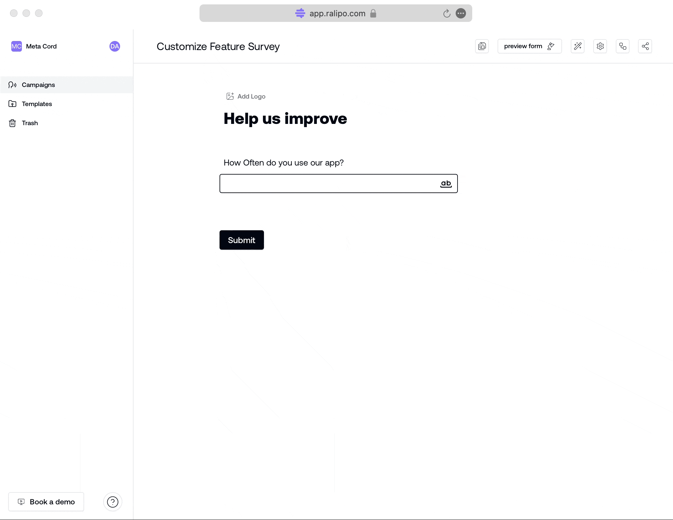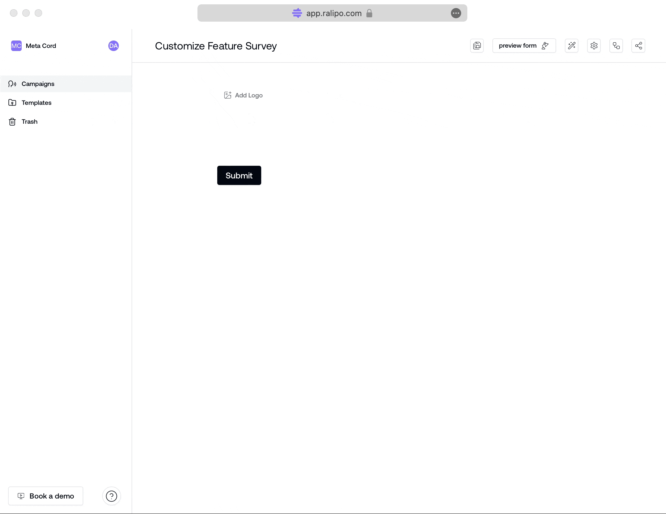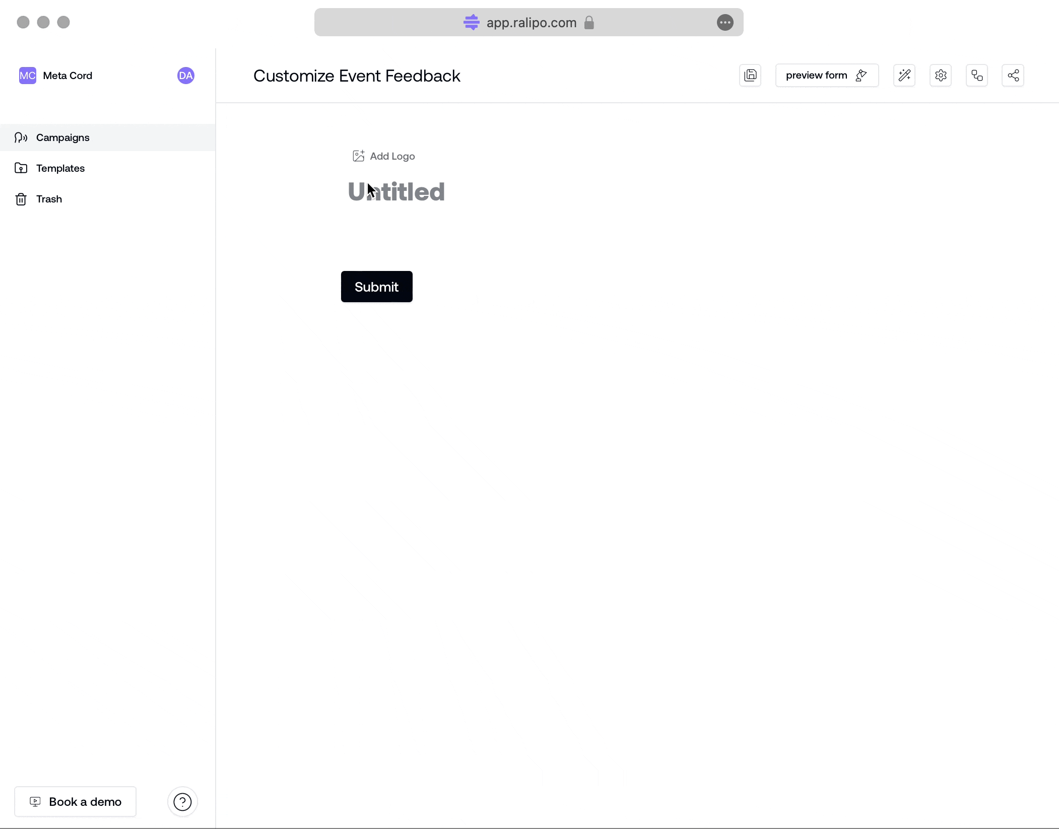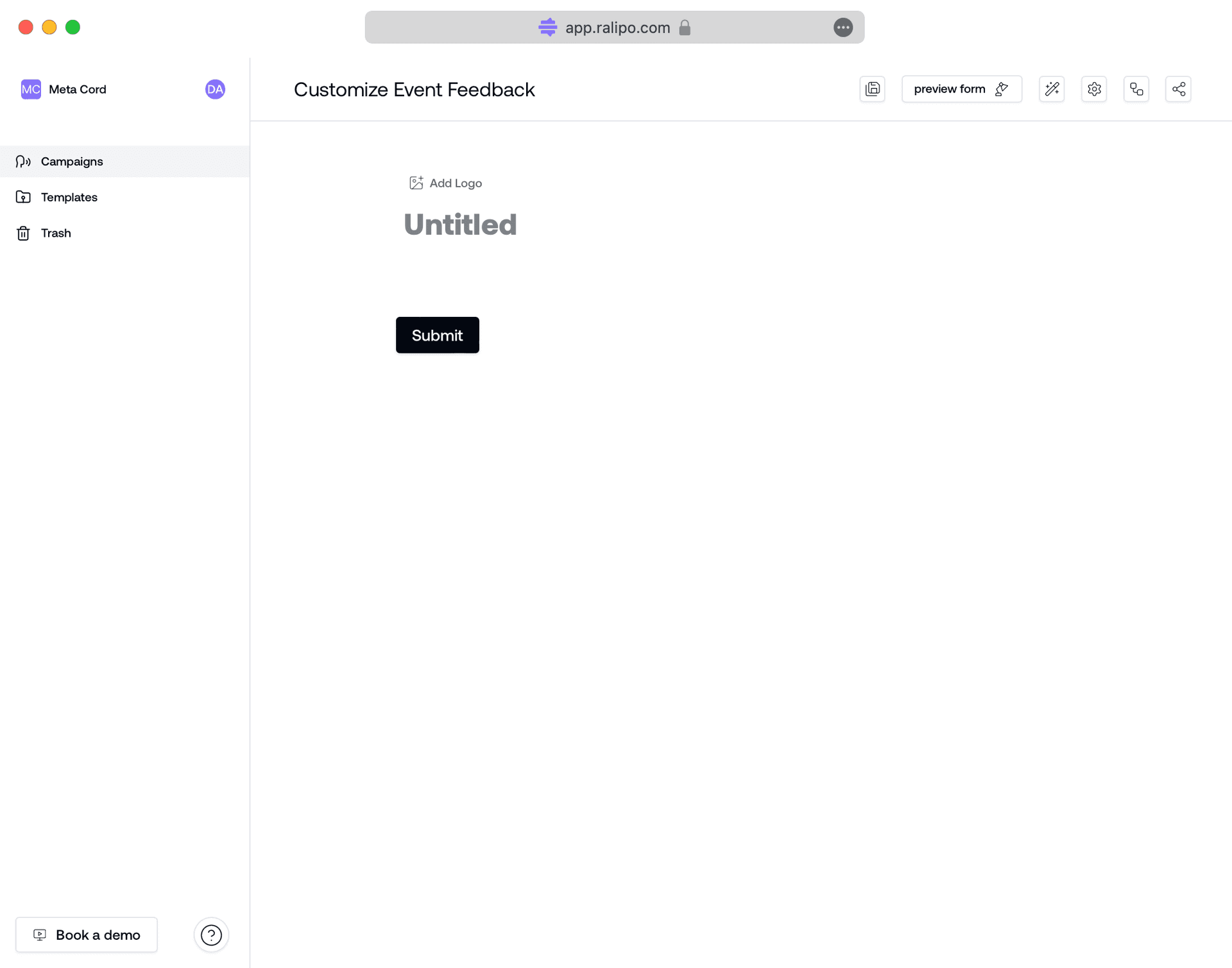 A Block is a basic unit on which campaigns are built in Ralipo. With blocks, you can add question fields, labels and other contents. When you first create a campaign page, it starts as a blank canvas with a pre-filled logo block, title block, and submit button.
