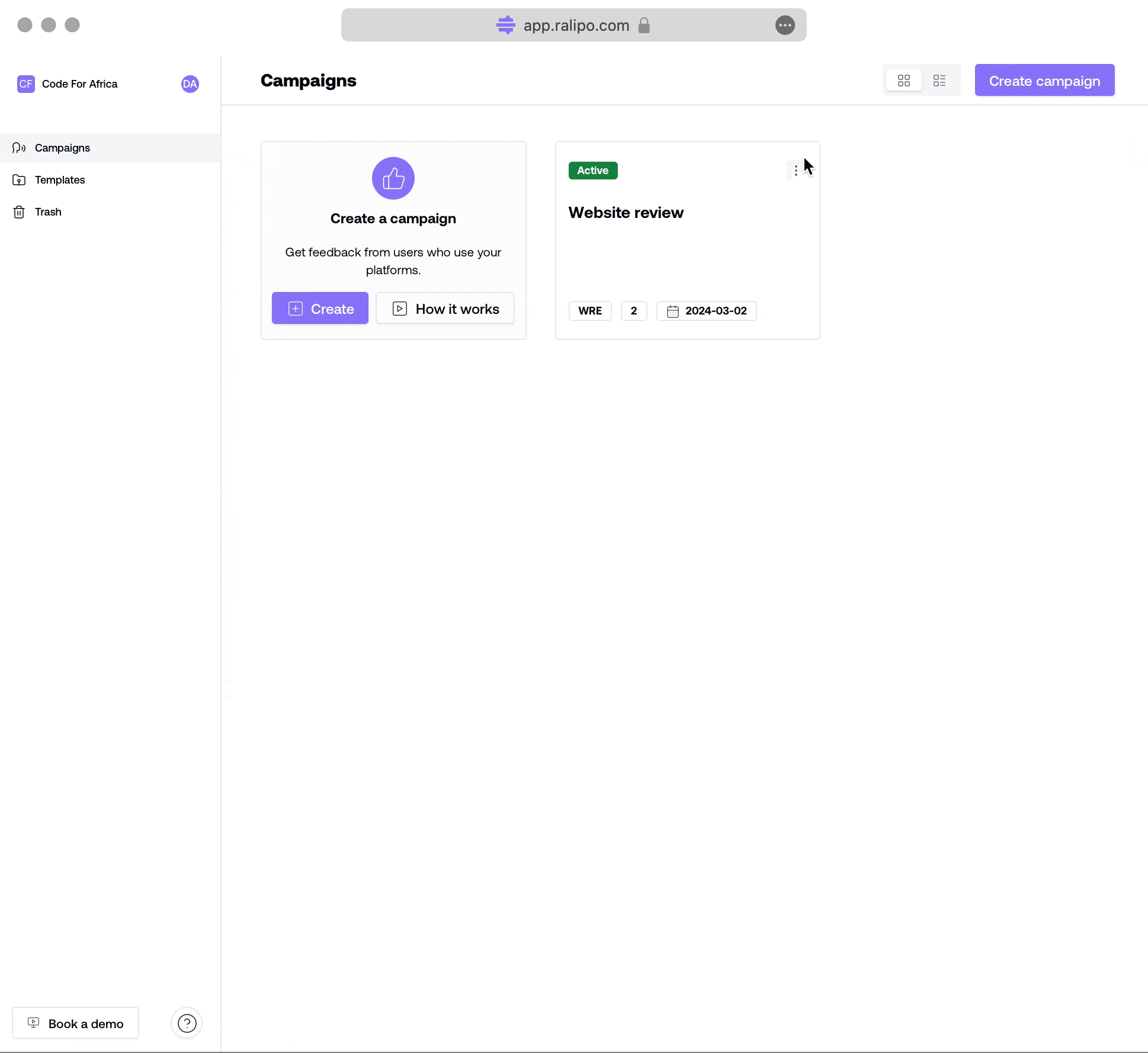 On creating a new campaign form, a box with the campaign name, campaign key, date created, feedback counts and campaign status (Active or Inactive) is displayed on the campaign card.