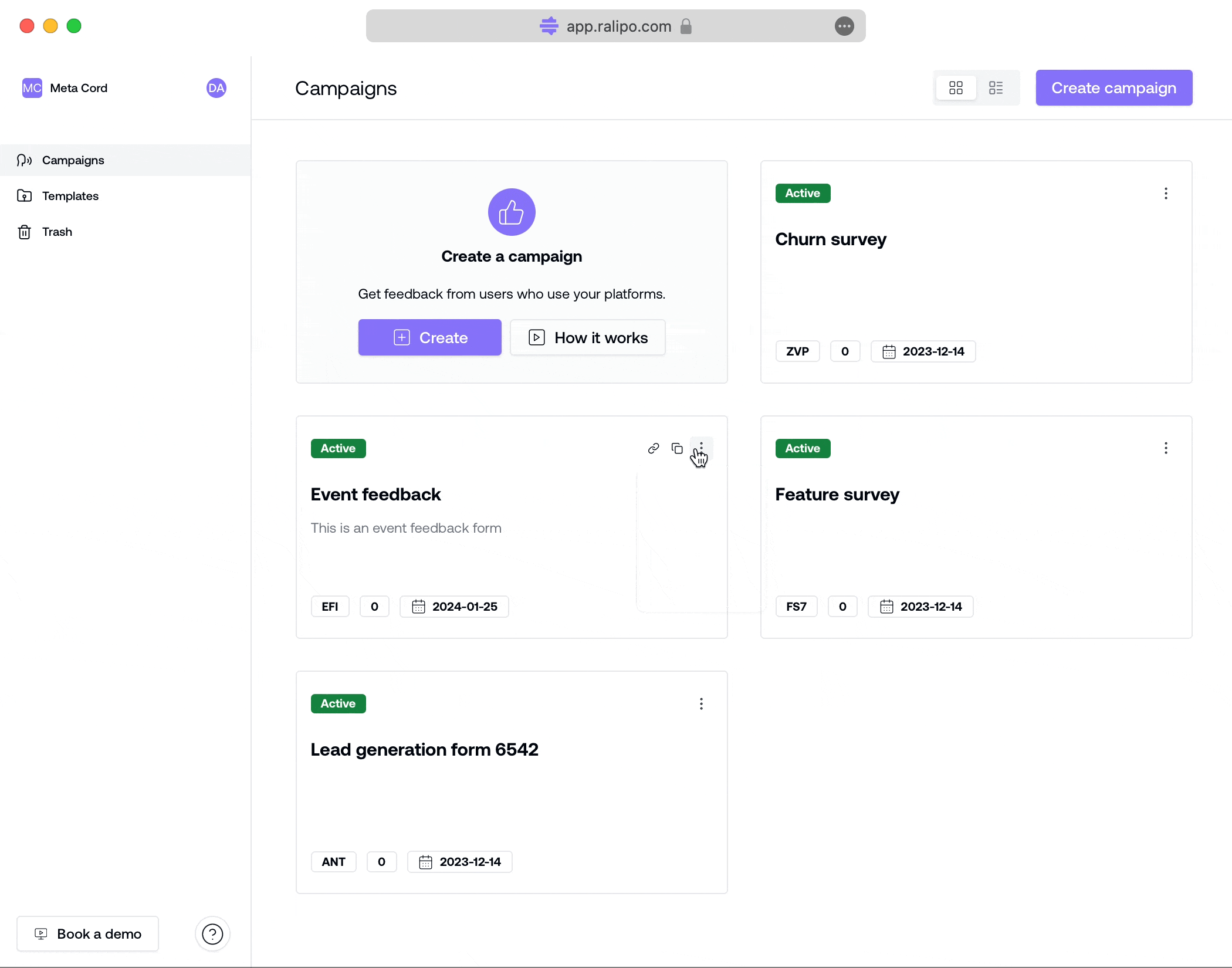 at the top right corner of the campaign card and select(⋮).Rename - A modal form is displayed with campaign name and description input fields to which you add or edit new changes.