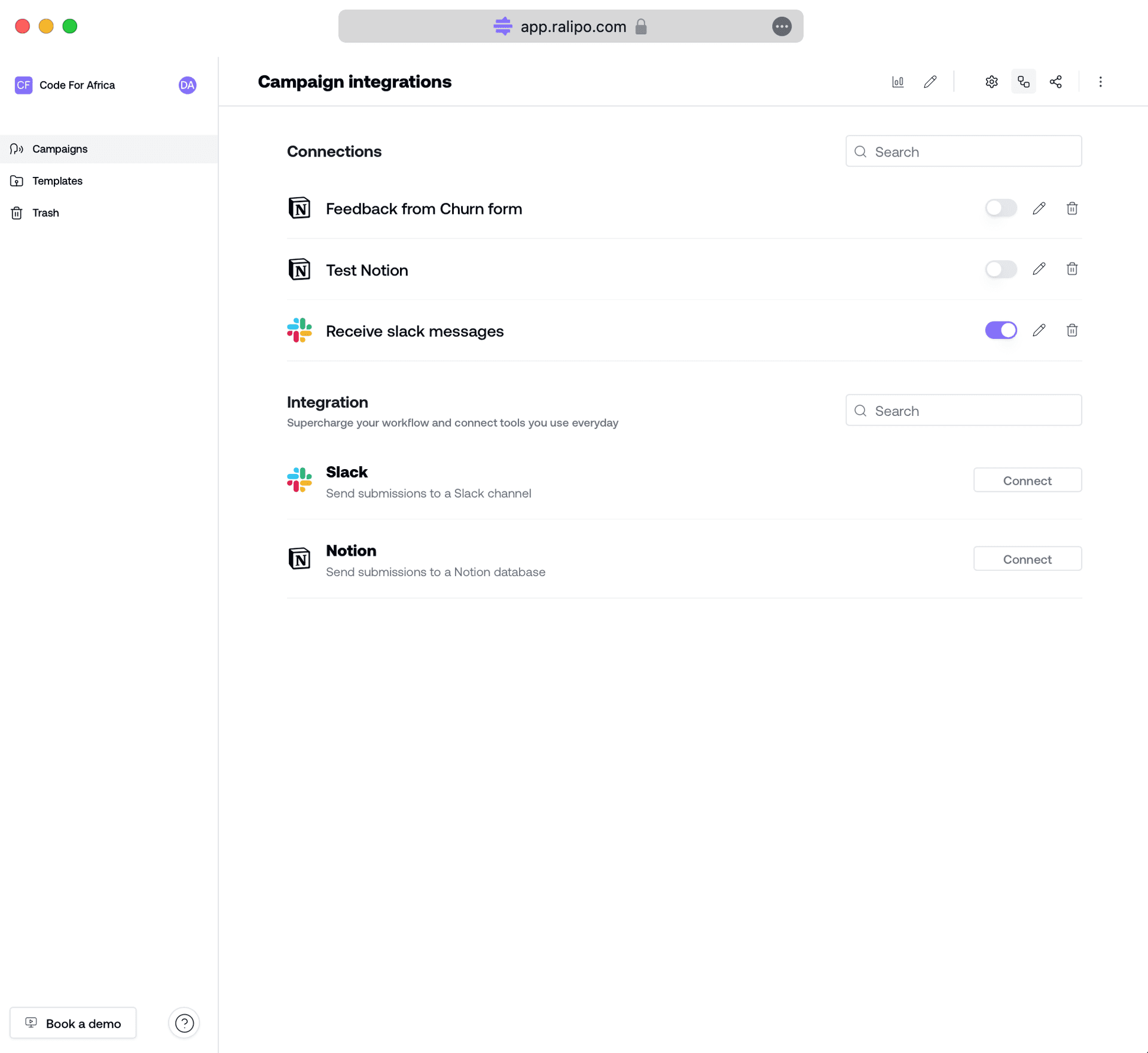 Ralipo integrates with 3rd party applications to help receive feedbacks in form of notifications, data sets.