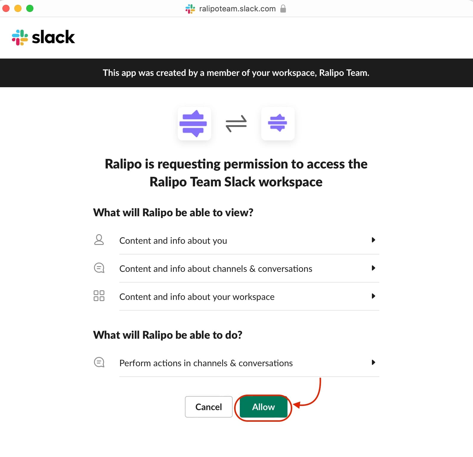 Ralipo connects to your team's slack account via Oauth2 where the need to autorise an access permission is required