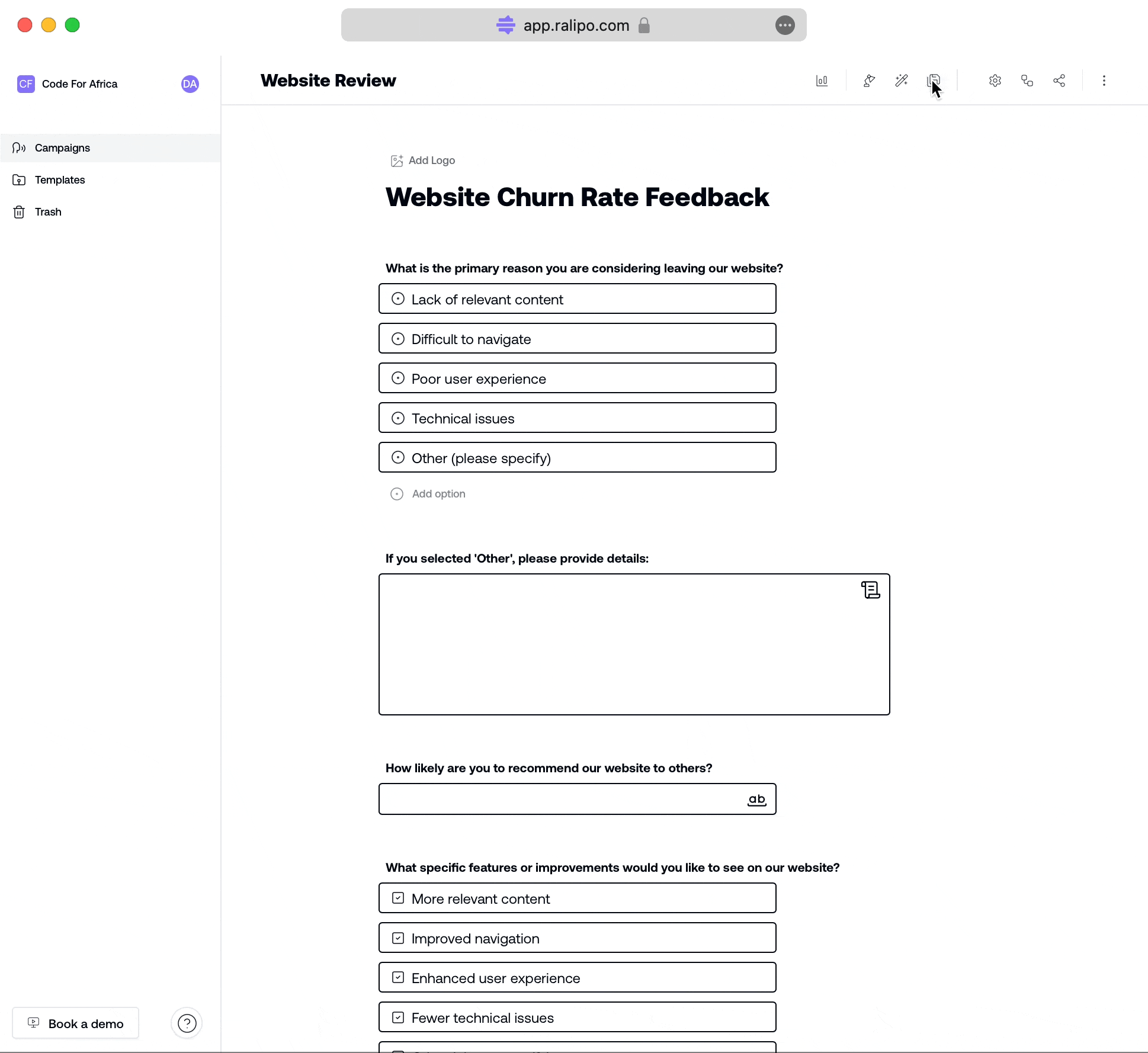 In addition to campaign creation, Ralipo offers various ways to collect feedback that can be easily integrated into campaign forms. This provides more options for your users to provide feedback intuitively.